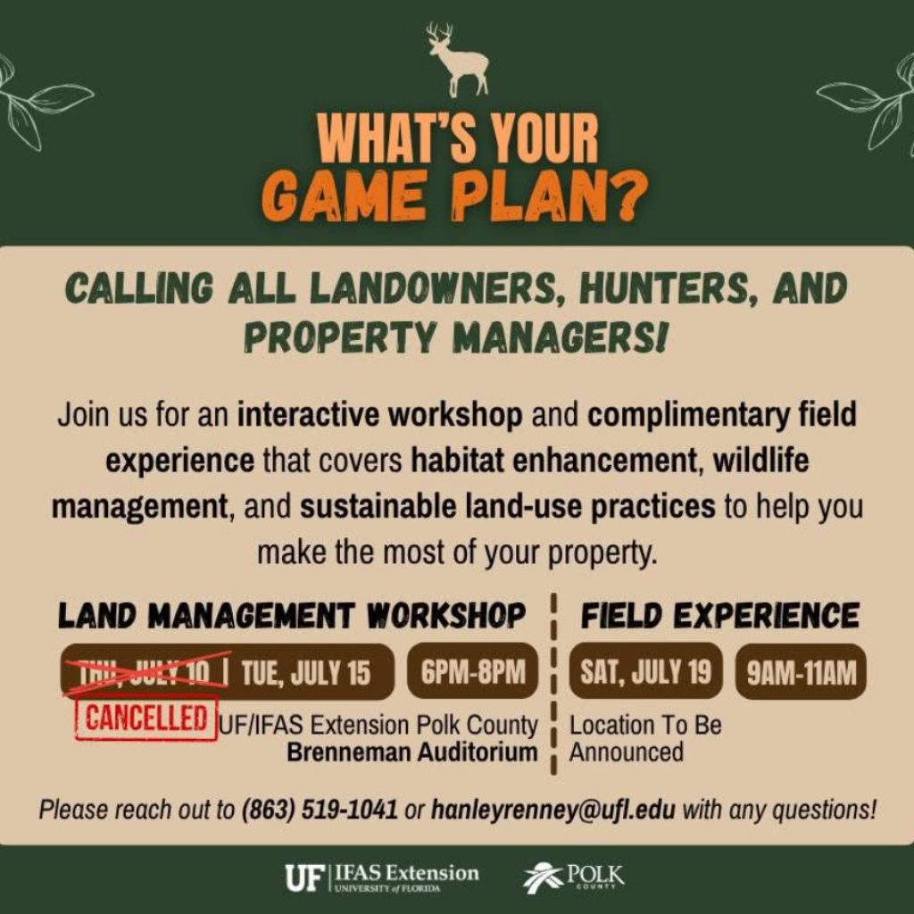 Join the “What’s Your Game Plan?” Habitat and Game Management Workshop hosted by UF/IFAS Extension Polk County on July 15 from 6-8 PM at Brennéan Auditorium, UF/IFAS Extension Office.