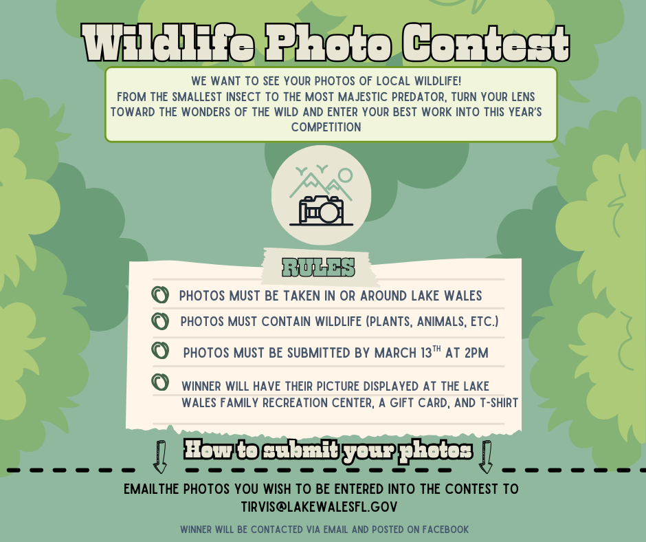 Guests will also have the chance to be featured at the Lake Wales Family Recreation Center and win prizes by submitting wildlife photography or artwork. This is a great opportunity for anyone who enjoys nature, wildlife, art, or photography.